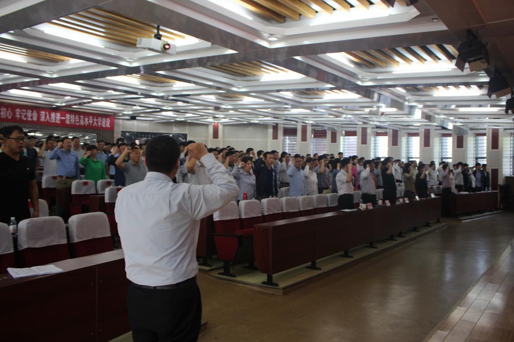 为切实增强“四个意识”,牢固树立“四个自信”,坚定不移推进全面从严治党,加强党员党性修养。2018年6月6日下午,PP电子游戏网站党总支于主教学楼一楼西报告厅举行全体党员重温入党誓词活动。校党委副书记、校长谭秀森同志、校长办公室主任郭建锋同志、组织部副部长冯英豪同志及PP电子游戏网站全体师生党员参加宣誓活动。