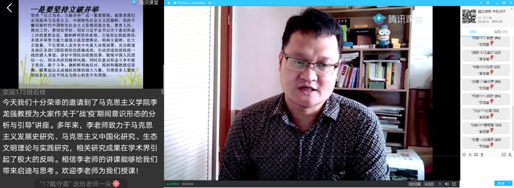 为了弘扬爱国主义精神,培育爱国主义情怀,做好爱国主义教育。3月27日上午10时,PP电子游戏网站“初心理论”学习社举办主题讲座活动。邀请马克思主义学院李龙强博士通过“腾讯课堂”APP开展线上专题讲座,解读中国为什么能够迅速控制住武汉疫情,分析中国特色社会主义制度的显著优势,引导学院学生树立战胜疫情的信心与决心。学院共计226名同学参加此次线上专题讲座。