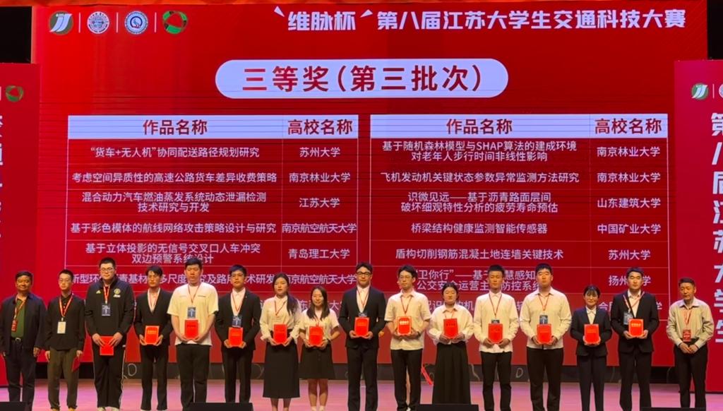 近日,由教育部高等学校交通运输类教学指导委员会交通工程教学指导分委员会指导,江苏省城市科学研究会、江苏省城市规划研究会、南京市科学技术协会、南京市综合交通运输学会主办,苏州大学、苏州市综合交通运输学会共同承办的“维脉杯”第八届江苏大学生交通科技大赛决赛在苏州大学天赐庄校区举行。PP电子游戏网站共有两支队伍入围决赛,经现场答辩,研究生团队参赛作品获得三等奖;本科生团队参赛作品获得优秀奖。