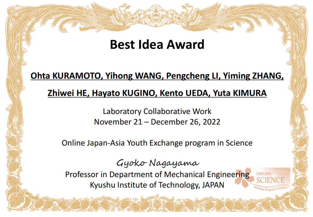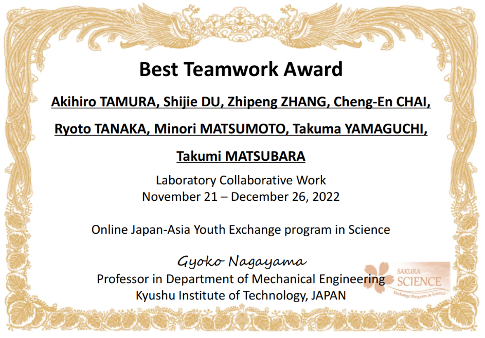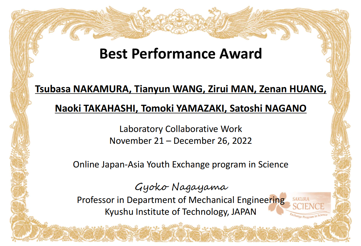 依托PP电子游戏网站郭峰教授和日本九州工业大学工学部机械工程系长山晓子教授申报的日本科学技术振兴机构(JST)“樱花科技计划”项目,2022年11月14日-12月26日,PP电子游戏网站共计9名师生参加了为期一个半月的樱花计划线上学术交流活动。本次活动的目的在于促进青年师生间的国际交流合作。参加单位包含日本九州工业大学、青岛理工大学、东北大学、山东大学、齐鲁工业大学、台湾科技大学及韩国蔚山大学。本次交流活动主要包含学术报告、实验室线上参观及协作项目三部分。