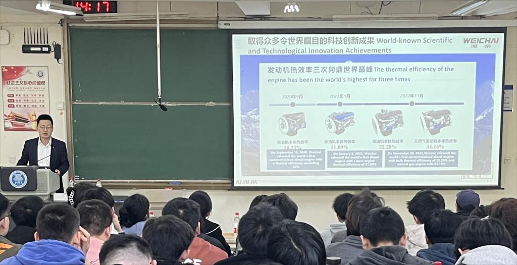 王意宝从国家碳达峰碳中和重大战略决策出发,与在场师生围绕发动机排放法规、高效柴油机技术发展趋势、发动机替代燃烧技术展开深入讨论。王意宝指出,全生命周期效能评估是当前发动机技术绿色性评价的重要指标,潍柴动力股份有限公司针对高效增压、低阻力、低摩擦等柴油机高热效率关键共性技术积极推进技术攻关,相继发布全球首款本体热效率50.23%、51.09%、52.28%的柴油机以及全球首款本体热效率54.16%的商业化天然气发动机,引领全球柴油机热效率技术突破。