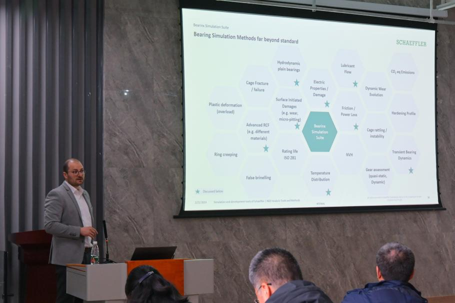 舍弗勒集团轴承技术专家Philipp Rödel应邀向全院师生做了题为“Bearinx Simulation Suite – The right solution for pioneering the motion”的学术报告,介绍了舍弗勒集团自主研发的Bearinx Simulation Suite在轴承系统设计和优化方面的应用,以及该系统在减少振动、提高运动稳定性以及延长轴承寿命方面的重要作用。Philipp Rödel还分享了舍弗勒集团与国际合作伙伴利用Bearinx Simulation Suite解决实际工程的合作案例,展示了该系统在不同行业和领域的广泛应用前景。在座的老师和同学们对Philipp Rödel先生的报告表现出了极大的兴趣,踊跃提问,与Philipp Rödel对Bearinx Simulation Suite在工程实践中的潜在应用进行了深入的探讨。此次学术报告不仅开阔了师生们的学术视野,也使在座师生对滚动轴承的系统设计有了更深刻的认识,受益匪浅。