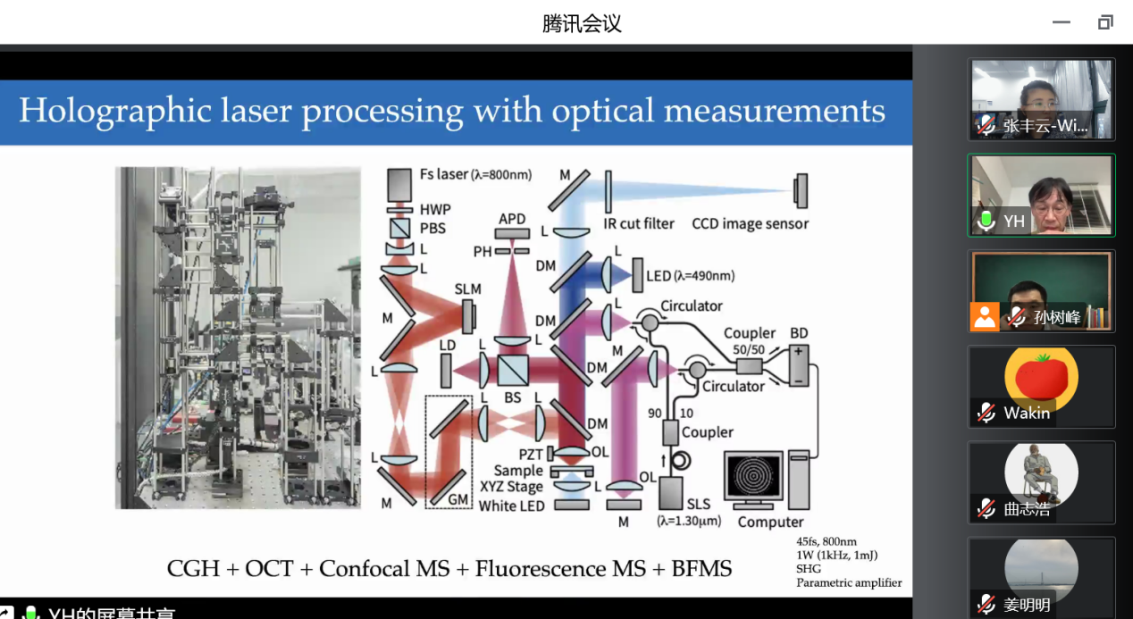 Yoshio Hayasaki教授对全息激光加工技术进行了详细的介绍,全息激光加工是通过加载全息图(CGH)的空间光调制器(SLM)对激光进行整形后对材料实施的激光加工,其核心是对计算机全息图的设计优化。通过在激光加工前和加工过程中优化全息图生成二维和三维聚焦光斑,可以自动补偿光学系统的静态缺陷和动态变化,因此全息激光加工具有高稳定性、高效率和高可用性。