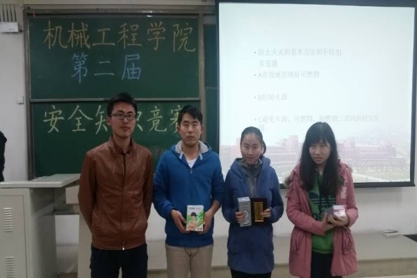 本次活动于4月10日在嘉陵江路校区二食堂门口举行了“问卷调查签名”活动,并开展安全知识竞答报名,同学们踊跃参加,报名现场热情高涨。4月12日晚在嘉陵江路校区主教学楼B320举办的“安全知识竞答”比赛现场更是气氛热烈,同学们积极抢答,各抒己见,使校园安全知识得到广泛普及。活动最后,一等奖由材料141班获得,二等奖由安全121班获得,三等奖由机械141班获得,出席本次活动的嘉宾为获奖集体颁奖并合影,本次“以我安全之心,换PP电子园和谐”为主题的安全月活动圆满结束。