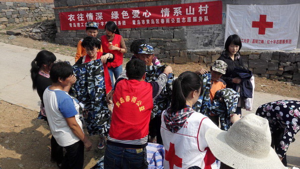 而就在10月17日上午7点在黄岛春雨公益协会的帮助下,将收集到的物资派送到了相距学校近百公里的日照市五莲县的一个山村,并在村里进行了免费发放仪式。在志愿者的努力下,花了四个多小时的时间将所有的衣物都发放给了村民们。在村民们的脸上志愿者们看到了感激的微笑和满足的幸福,更感受到了传递爱心的光荣使命感。