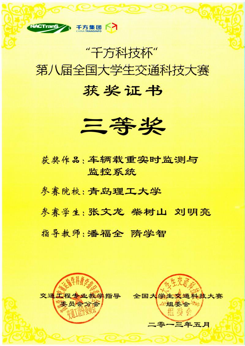 5月25日至26日,由教育部高等学校交通运输与工程学科教学指导委员会主办、北京工业大学承办,以“顺畅交通”为主题的第八届全国大学生交通科技大赛决赛在北京举行。本届大赛共有全国86所大学报名,198件作品参加选拔,经过专家组评审,仅有来自51所学校的80件作品进入决赛。我院由潘福全、隋学智老师指导,张文龙、柴树山、刘明亮同学合作完成的《车辆载重实时监测与监控系统》荣获三等奖。