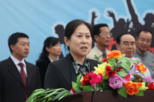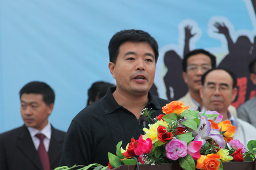 青岛汽车行业协会秘书长李伟在发布会上致辞。校团委书记陈伟向车队授予了出征旗帜。