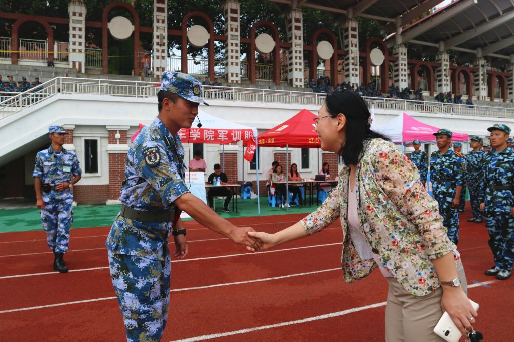学院领导到达训练场后,在随训辅导员老师的带领下,岳丽宏书记一行人依次走访了正在场上进行训练的七个学生连队,与每一位教官握手以示感谢,同时也对每一位正在认真训练的同学表示肯定和鼓励,同学们对于领导、老师们的关怀表现出极大的热情和感激。随后,岳丽宏,郭峰为每一位教官送上暖心礼品,以此表达对各位教官军训期间认真负责的赞许及辛勤付出的感谢,并与各教官合影留念。最后,岳丽宏也不忘对随训辅导员老师们表示关心,感谢他们一直以来的辛勤陪伴。