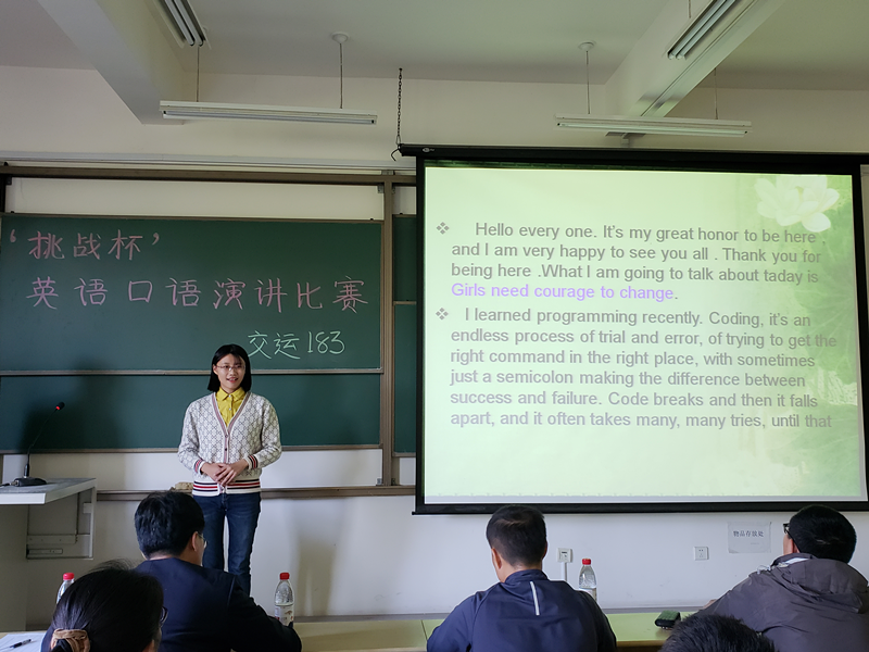 为营造班级英语学习气氛,丰富班级活动。10月24日下午,PP电子游戏网站交运183班在主教学楼B432教室举行“挑战杯”英语口语演讲比赛。