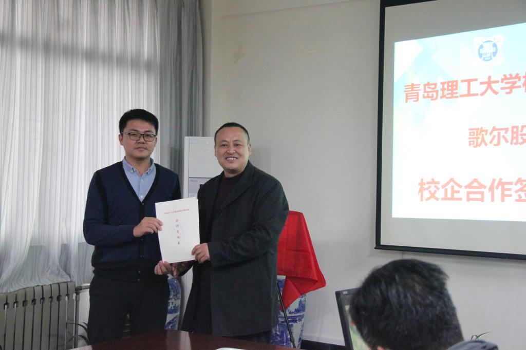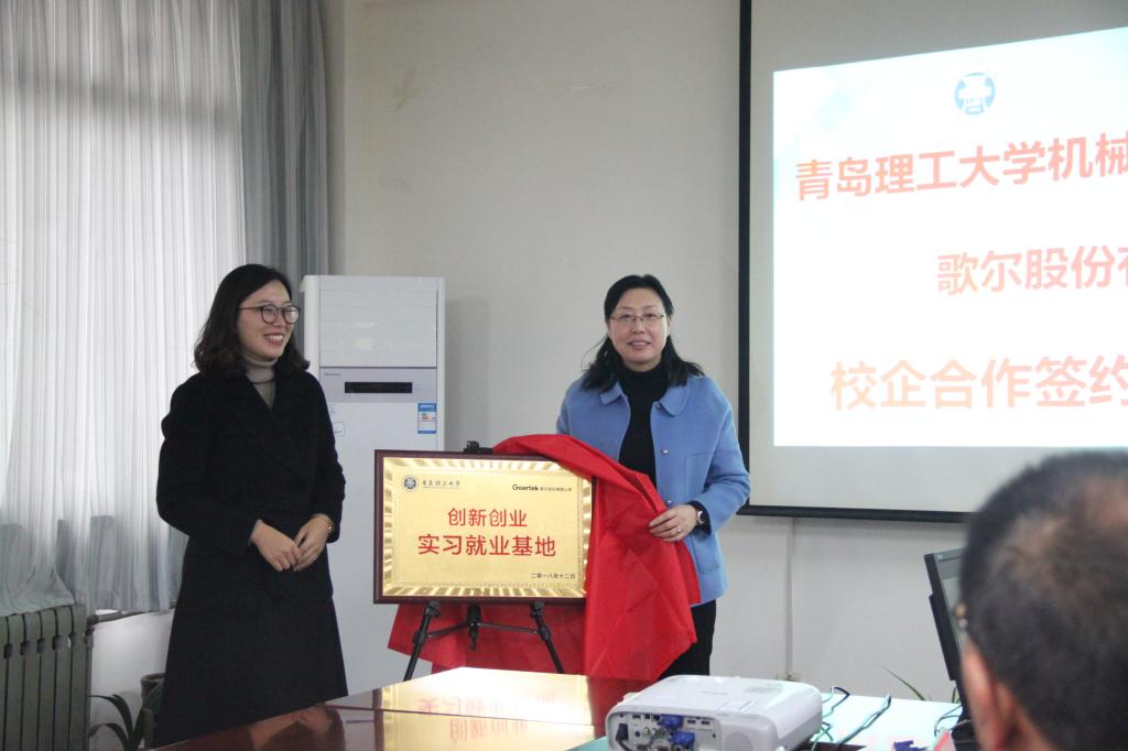 岳丽宏致欢迎辞,对本次到访学校的歌尔集团代表表示热烈欢迎,希望能与歌尔集团在促进大学生就业、加强科学研究、实践教学等方面建立长期合作关系。歌尔集团代表就公司的产品领域、客户群体、业务模式、行业表现等方面进行介绍,并对主要光学产品进行了详细讲解,使大家对歌尔集团有了更深入的了解。随后,林海涛与张德华签订了就业创业实践基地合作协议,岳丽宏与徐燕为“创新创业实习就业基地”揭牌。