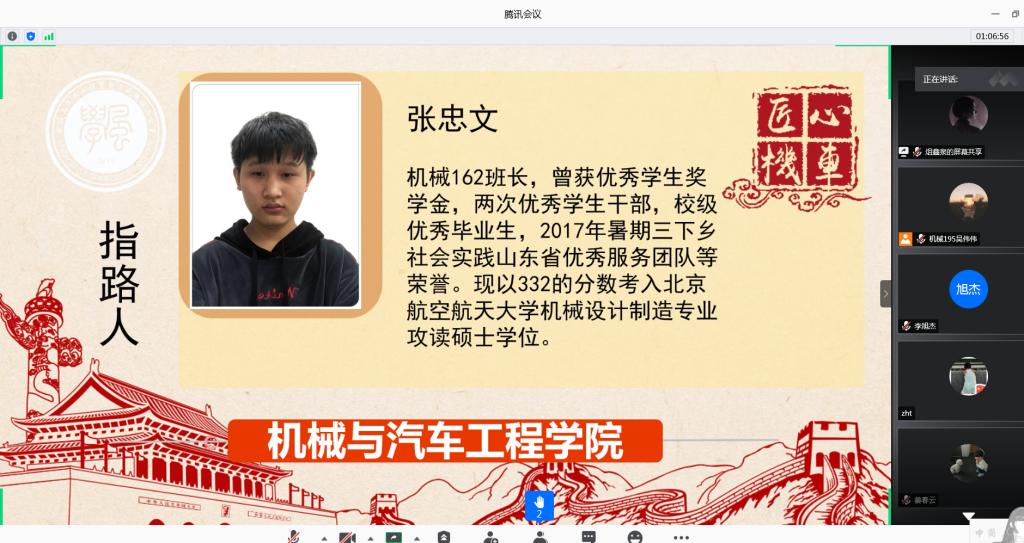 为进一步加强学院学风建设,提高广大同学的考研积极性和备考自信心,7月7日晚,PP电子游戏网站第31期匠心机车讲坛—“考研之路漫漫,前辈出招指南”在线上开展。本次交流会邀请了王鑫雨(山东大学研究生在读)、闫彩莲(东北大学)、张忠文(北京航空航天大学)和王俊博(山东大学)四位优秀的学长学姐进行线上交流分享,200余名学生参加此次交流会。