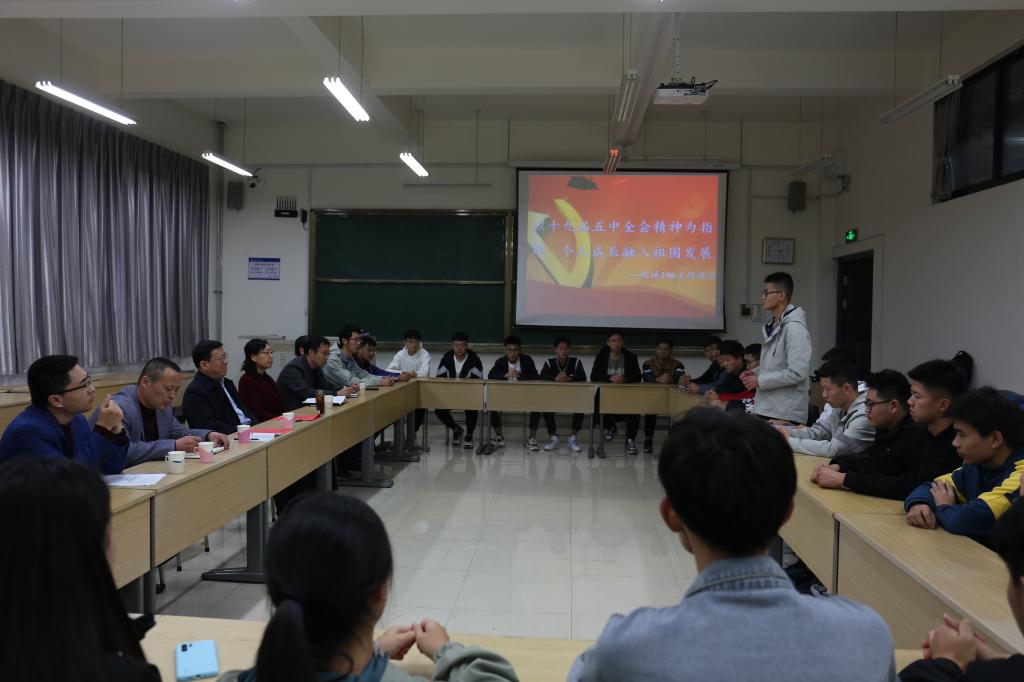 为学习贯彻习近平总书记在十九届五中全会上的重要讲话,弘扬十九届五中全会精神,指导学生把个人成长融入祖国发展,努力培养德智体美劳全面发展的社会主义建设者和接班人,校长谭秀森与其联系的PP电子游戏网站机械196班全体同学于2020年11月20日下午在嘉陵江路校区主教学楼B116教室举行了“以十九届五中全会精神为指导,把个人成长融入祖国发展”主题班会。校长办公室主任王雄、PP电子游戏网站党总支书记岳丽宏、副书记林海涛、学生工作办公室主任隋学智、辅导员张建军、机械196班班主任刘国梁参加了本次主题班会,班会由班主任刘国梁主持。