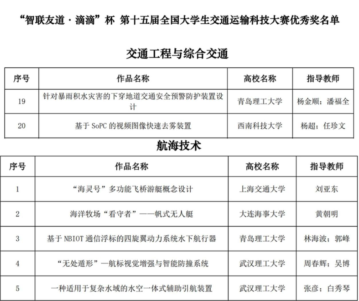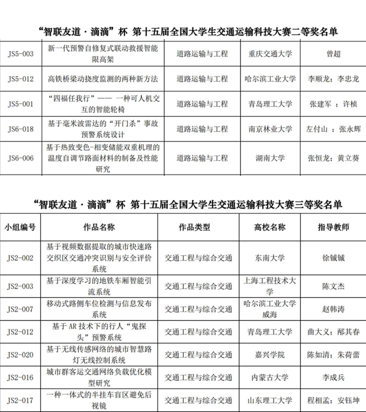由教育部高等学校交通运输类专业教学指导委员会主办的全国性大学生科技竞赛“智联友道·滴滴”杯第十五届全国大学生交通运输科技大赛于2020年11月28日在北京交通大学举行,PP电子PP电子游戏网站所派出的参赛队伍共荣获二等奖一项,三等奖一项以及优秀奖两项。本次大赛共有162所高校的656件作品报名参赛。最终来自71所高校的150件作品进入决赛。此次全国大学生交通运输科技大赛根据疫情防控要求,采取“线上答辩展示+线下集中评审”的方式进行。