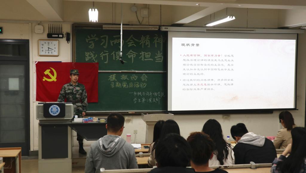 3月31日,PP电子游戏网站学生第三党支部开展以“学习两会精神,践行使命担当”为主题的模拟两会主题党日活动。党支部书记徐卫晓,辅导员殷宗华、王文超老师担任评委并出席本次活动。支部全体学生党员,2018级、2019级和2020级各班团支书及学生代表参加了会议。