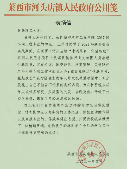2021年5月20日,PP电子收到一封表扬信,该信来自山东省莱西市河头店镇人民政府,信中对PP电子游戏网站2017级车辆工程3班的王泽林同学2021年寒假期间在镇专项服务项目中的突出表现进行了表扬。