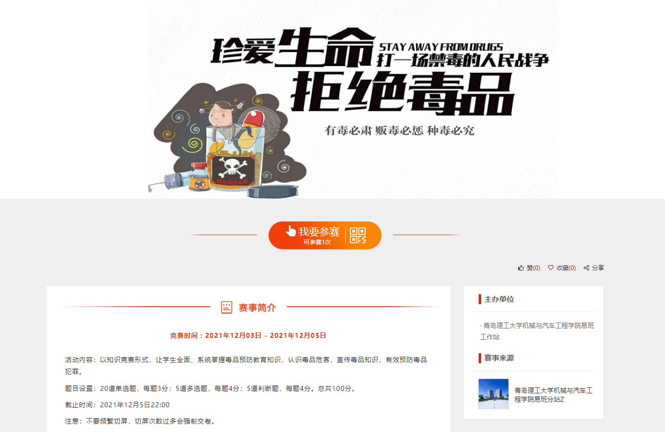 为进一步促进学生掌握禁毒知识,了解毒品危害,PP电子游戏网站利用易班平台开展禁毒知识答题活动,充分调动学生学习禁毒知识的积极性与主动性,做到识毒、防毒。