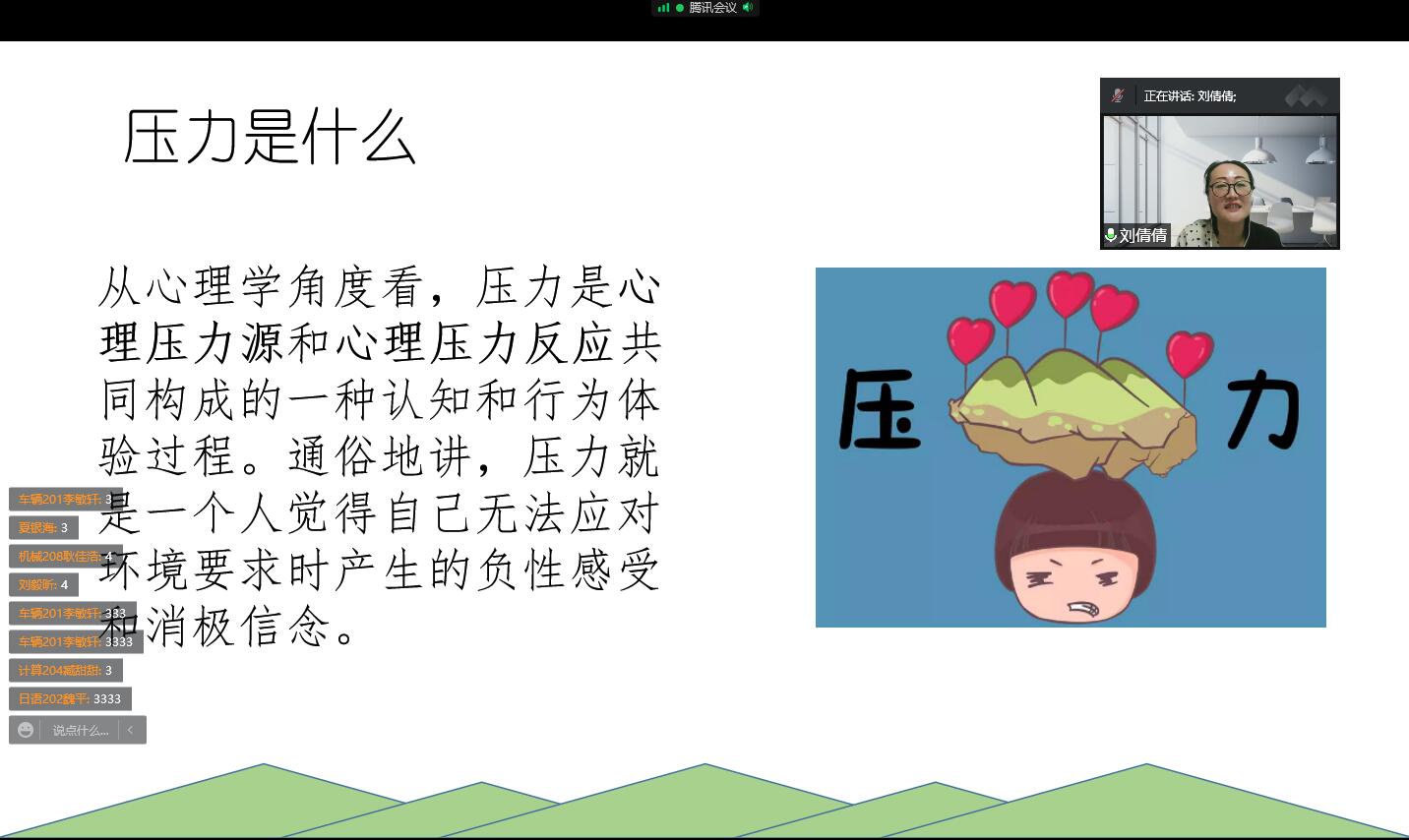 缓解心理压力,增进心理健康。“刘老师的报告既有理论高度,也有很强的实践操作性,学生心理健康成长与教育者积极引导息息相关,不同年级的学生面临的压力不一样,我们要掌握心理健康知识,帮助学生及时感知压力、化解压力,为学生解疑答惑。”人文与外国语学院心理联络员辛雪梅这样说。机械204班王政说:“刘老师的讲课让我学到很多,接下来我要正确看待学习压力,变压力为动力,在压力中成长为更好的自己。”