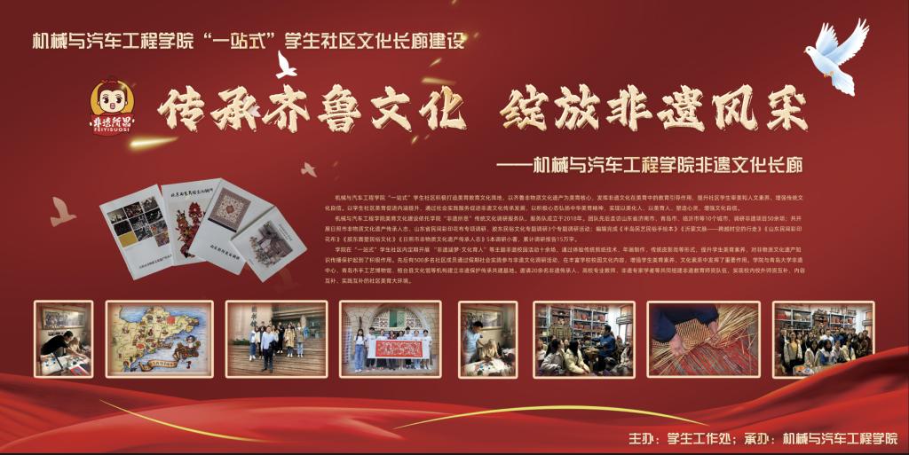 “传承齐鲁文化,绽放非遗风采”学生社区文化长廊展览活动由学生工作处主办,PP电子游戏网站承办,旨在弘扬中华传统文化,将学生公寓打造成大学生美育教育文化阵地,以齐鲁非物质文化遗产为美育核心,发挥非遗文化在美育中的教育引导作用,提升社区学生审美和人文素养,坚定文化自信自强。
