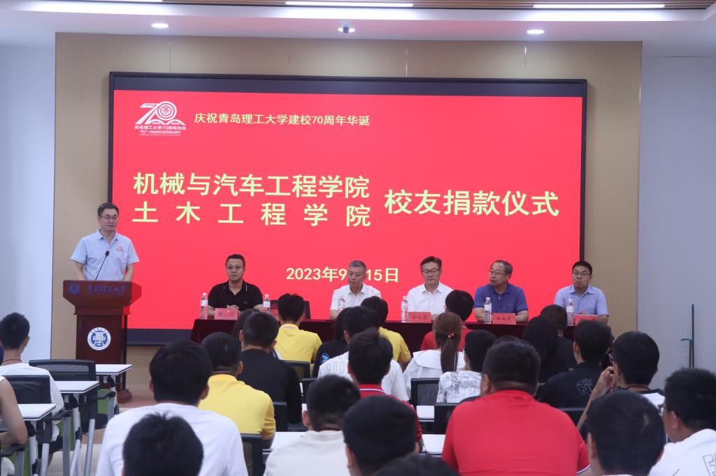 郭建敏现场分享了在青岛理工大学求学期间的经历和收获,介绍了公司取得的优秀业绩,分享了自己工作经验和体会,尤其感恩母校的教育和培养,感恩母校对自己成长过程中良好人生观养成的滋养。他表示,毕业后,一直关注母校的发展,回馈母校是他长久以来的愿望,此次捐赠是一个开始,希望未来能为母校的建设发展贡献更大力量。同时,也期望学弟学妹们认真学习专业知识、养成良好的道德品质,为母校增光,为社会发展做出贡献。