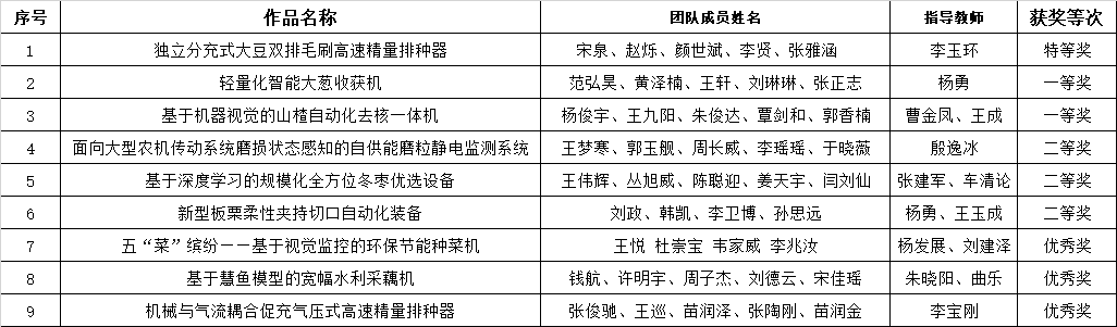 本届大赛以“创新赋能农装,智能引领未来”为主题,以培育行业亟需的“专业知识雄厚、动手能力较强、创新创业能力过硬”的现代农业装备创新创业人才为目标。大赛共设置A类(自由选题类)、B类(机器人类)、C类(企业出题类)、D类(概念设计类)四个类别竞赛项目。PP电子游戏网站共有9个项目从126所高校的1203个项目中脱颖而出,其中,李玉环老师指导的《独立分充式大豆双排毛刷高速精量排种器》荣获大赛A类特等奖,杨勇老师指导的《轻量化智能大葱收获机》和曹金凤老师、王成老师指导的《基于机器视觉的山楂自动化去核一体机》荣获大赛A类一等奖。