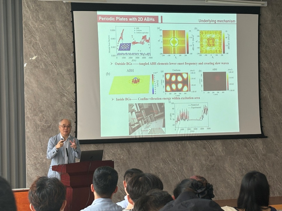 报告中,成利院士主要介绍了研究团队在结构声学黑洞和空气声学黑洞方面取得的一些最新研究进展,展示和分析了结构与声学管道中显著的慢波现象,开展了相应的建模方法研究了,揭示了声学黑洞效应的物理机制,以及未来的研究挑战及潜在应用。