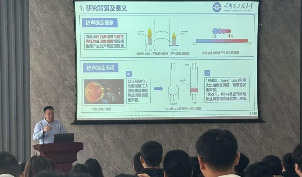 杜敬涛教授在报告中基于光滑傅里叶级数法构建了管道热声耦合振荡系统分析模型,提出了一种基于热声效应的压电俘能系统,揭示了任意阻抗边界条件下管腔热声俘能装置的声学与俘能特性,并探讨了结构参数、外部负载、边界阻抗对该系统声学与俘能特性的影响。