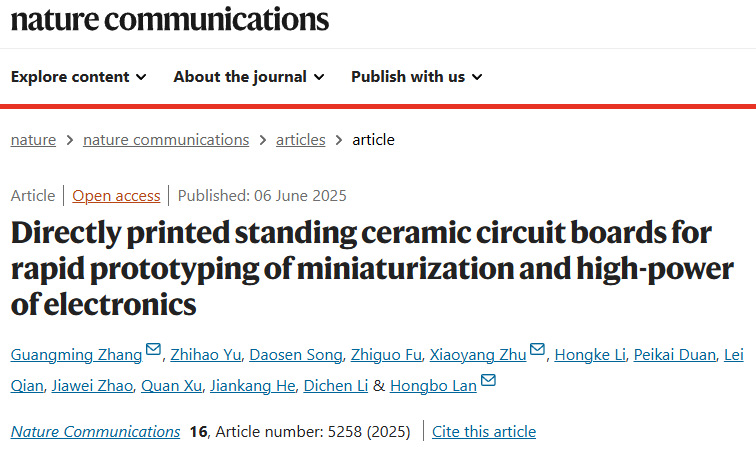 近日,PP电子PP电子游戏网站张广明教授在微纳3D打印高分辨率陶瓷电路板的课题中取得了重要进展,相关研究成果以题为《Directly printed standing ceramic circuit boards for rapid prototyping of miniaturization and high-power of electronics》的论文发表在国际著名期刊《Nature communications》(中科院大类一区,IF:14.7),实现了PP电子机械工程学科在该期刊零的突破。青岛理工大学为第一完成单位,张广明教授为第一作者和第一通讯作者,兰红波教授和朱晓阳教授为共同通讯作者。