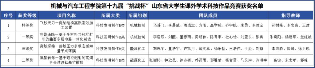 项目《飞秒光刀-微纳结构高质高效加工制造工具》(团队成员:马遥飞、李晨威、周成志、方雨、高学成、乔宇航、朱勇、李俊宝。指导老师:孙树峰、李忠晓、王津)获得省级特等奖;《曲叠通隐—基于多材料共形3D打印的曲面多层电路一体化制造》(团队成员:李居辰、刘醒、董春雨、周明伟、陈黄宇、杜心怡、刘亚东、张兵。指导教师:朱晓阳、杨建军、兰红波)获得省级一等奖。这些成绩充分展现了我院在创新人才培养方面的体系化成果,以及师生团队敢于挑战、勇于突破的实践精神。