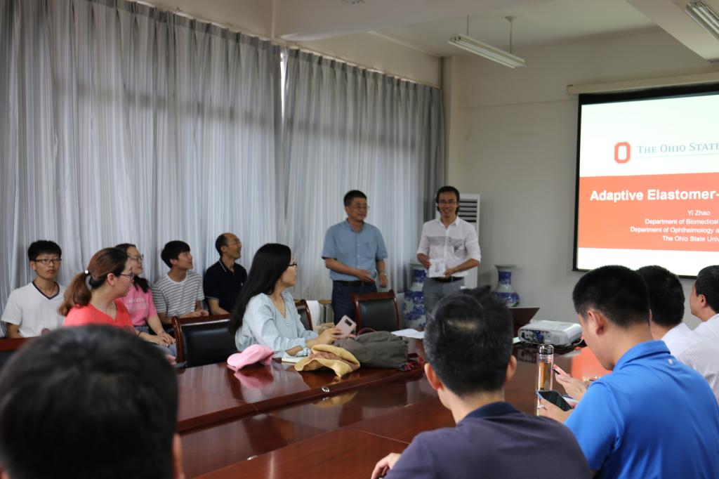 7月12日上午,应PP电子PP电子游戏网站彭子龙副教授邀请,美国俄亥俄州立大学( The Ohio State University )工程学院Yi Zhao教授在嘉陵江路校区主教学楼A414做了题为“Adaptive Elastomer-Liquid Lenses”学术报告。郭峰院长主持报告会,副院长王优强、相关专业教师及研究生40余人参加。
