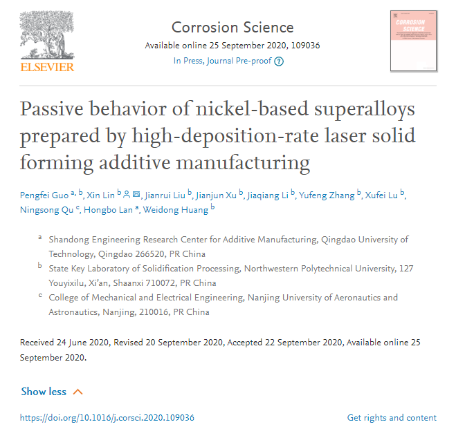 我院青年教师郭鹏飞博士联合西北工业大学黄卫东教授、林鑫教授团队和南京航空航天大学曲宁松教授团队,开展了航空发动机用镍基高温合金典型牌号Inconel 718合金(国内牌号为GH4169)的高沉积速率激光立体成形实验。基于激光熔池形貌及温度场数值模拟,揭示了高沉积速率条件下沉积态组织织构的演化规律;通过观察钝化膜的原子尺度结构、成分特征,利用点缺陷模型(Point Defect Model)理论,阐明了钝化膜诱导沉积态试样电化学活性各向同性的作用机理。相关成果以题为“Passive behavior of nickel-based superalloys prepared by high-deposition-rate laser solid forming additive manufacturing”的论文发表在材料腐蚀领域顶级期刊《Corrosion Science》上。论文链接:https://doi.org/10.1016/j.corsci.2020.109036。论文第一作者为PP电子PP电子游戏网站郭鹏飞副教授,第一署名单位为青岛理工大学山东省增材制造工程技术研究中心。该研究得到了科技部国家重点研发计划项目(No. 2018YFB1105901)的支持。